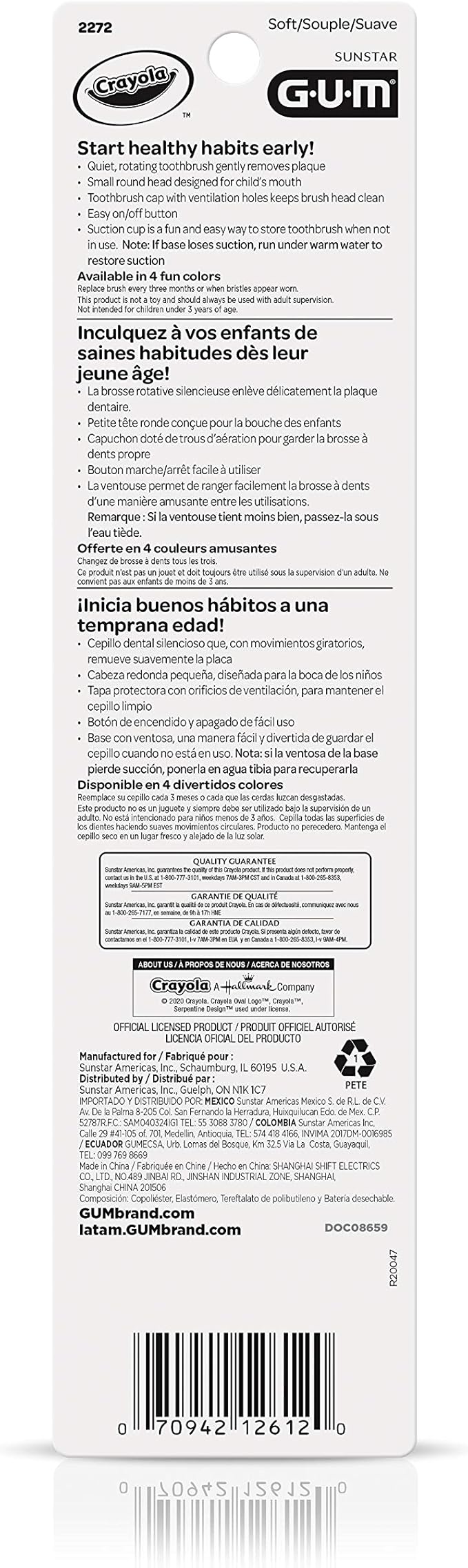 GUM Crayola Power Toothbrush for Kids, Extra Soft Bristled Toddler Toothbrushes, Travel Cap + Suction Cup Base, Batteries Included, 1 Count