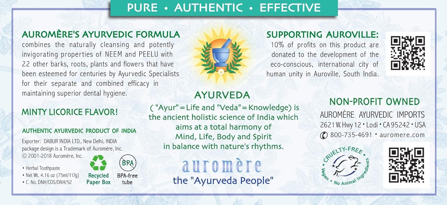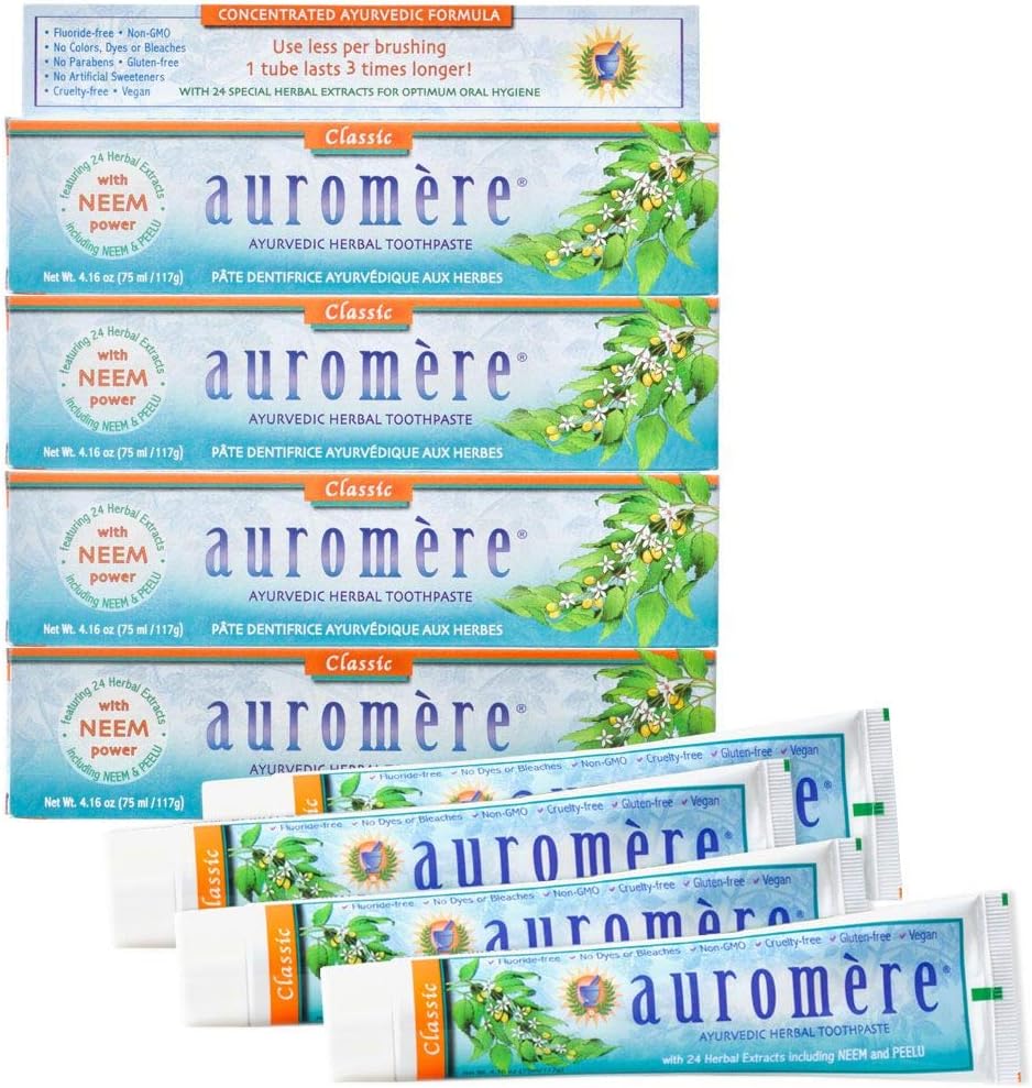 Auromere Ayurvedic Herbal Toothpaste, Classic Licorice Flavor - Vegan, Natural, Non GMO, Fluoride Free, Gluten Free, with Neem & Peelu (4.16 oz), 4 Pack
