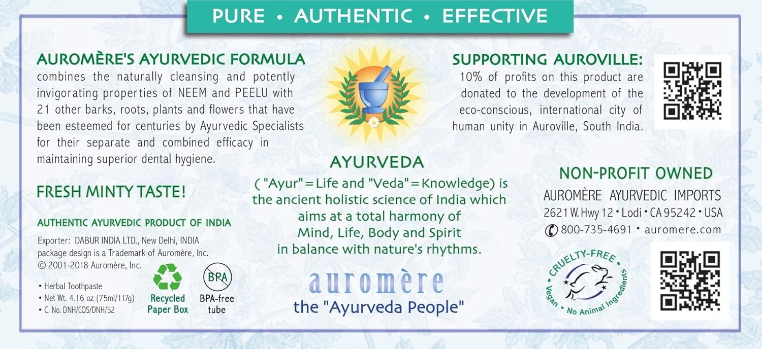 Auromere Ayurvedic Herbal Toothpaste, Fresh Mint - Vegan, Natural, Non GMO, Flouride Free, Gluten Free, with Neem & Peelu (4.16 oz), 5 Pack