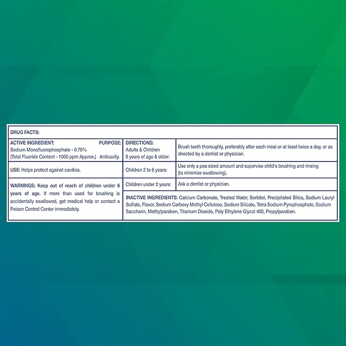 - ACTIVE INGREDIENT - Sodium Monofluorophospate .76% fights and protects against cavities for heathier teeth - ANTICAVITY