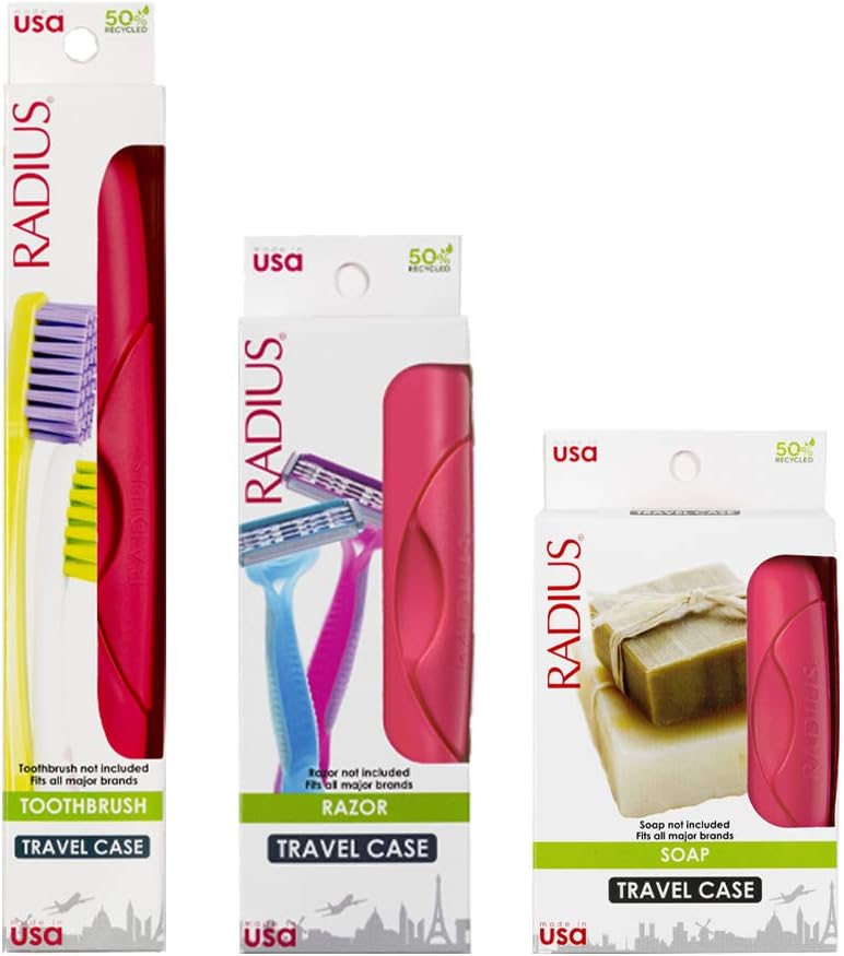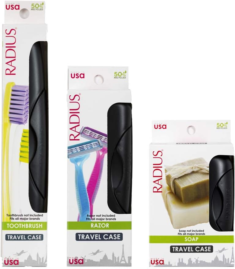- RADIUS CASE EASY OPEN & CLOSE: Our Travel Cases utilize patented “living hinge” technology for streamlined opening and has a snap lock for secure drip free closure. RADIUS Toothbrush Portable Travel Case Kit: Contains 3 pieces1 Toothbrush Case 1 Soap Case and 1 Razor Case.