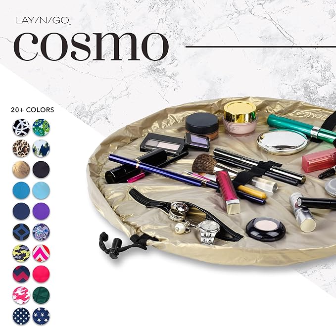 Lay-n-Go Cosmo Drawstring Cosmetic & Makeup Bag Organizer - Portable Drawstring Bag w/Zipper Pocket, Makeup Loops & More - Durable, Machine Washable Toiletry Bag for Travel (20", Metallic Gold)