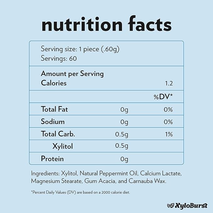 - BOOST ORAL HEALTH - Professional studies suggest that high xylitol consumption, coupled with daily brushing, reduces tooth decay risk. XyloBurst sugar free mints provide an easy way to reach the recommended 6 to 8 grams of xylitol daily, promoting healthier gums and teeth, leading to fewer cavities and a brighter smile.