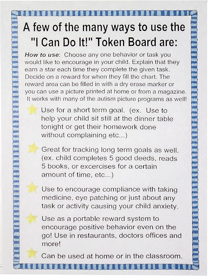 - PERFECT FOR FOCUSING ON SPECIFIC TASK – The "I Can Do It!" Token Board star chart for kids is our most versatile chart because it allows you to focus on whichever specific task, behavior, or goal you’d like your child to improve. The chart is fully compatible with dry erase markers. There’s a place for your child’s name, goal, and five star-rewards boxes. It also works with most Autism picture programs.