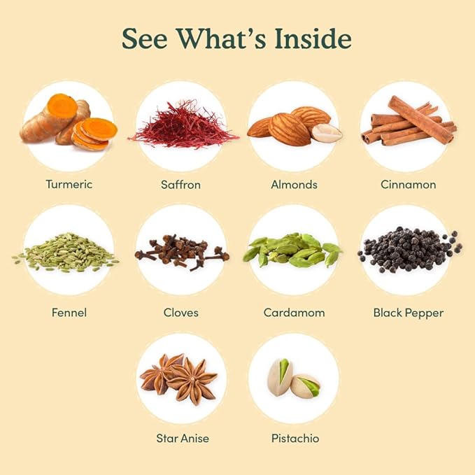 - TURMERIC 'THE MAGIC HERB' - Embrace the timeless allure of our Turmeric Saffron Herbal Tea Tisane. This blend weaves together pure golden Turmeric chunks and the richness of Saffron, Cardamom, Almonds, Pistachios, Ginger, Cinnamon, Clove & Star Anise resulting in a smooth herbal infusion. With no caffeine, it's perfect for any time of the day.