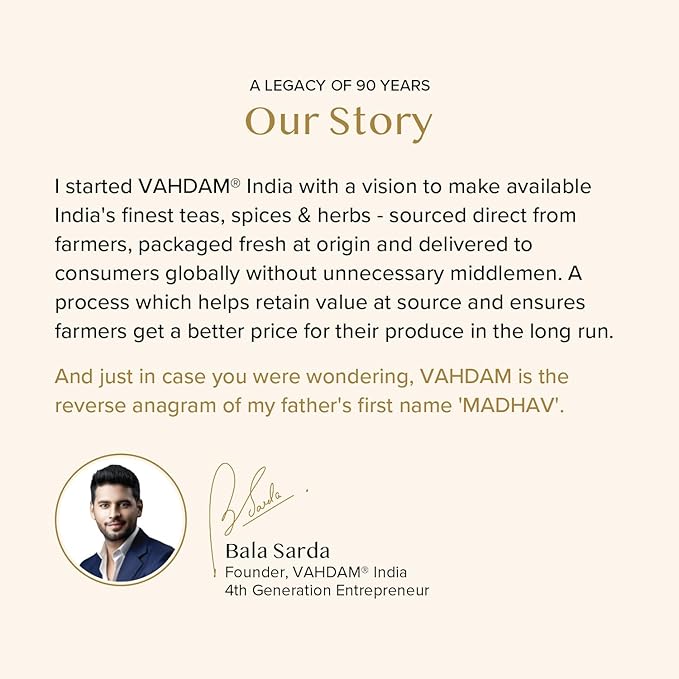 - A BRAND WITH A BILLION DREAMS - VAHDAM India is one of India's largest digitally native, global brands, shipping to over 3 million customers across 130+ countries. With an aim to bring India's finest Teas, Brew Ware, Spices & Herbs to consumers across the world under a home-grown, sustainable label with a strong commitment to people and planet.
