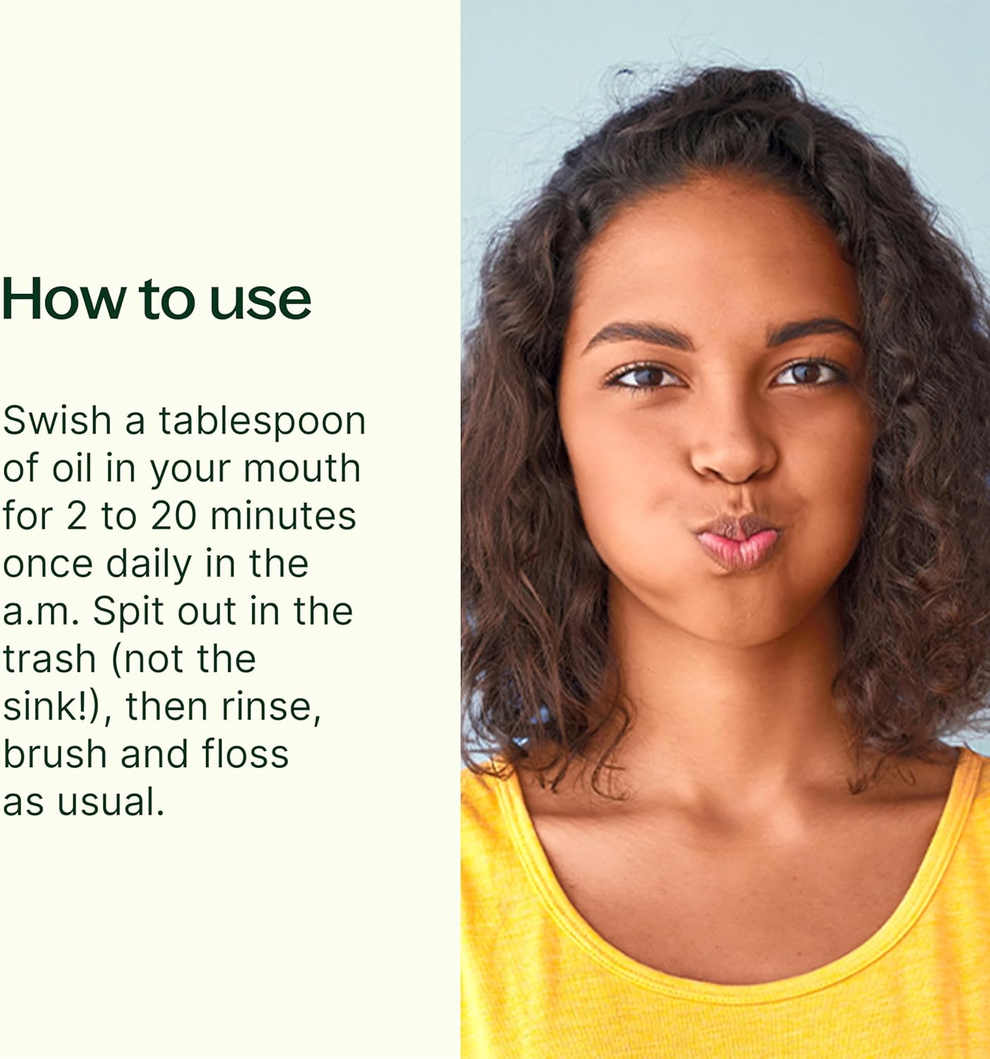 - Easy to Use: Simply add a tablespoon in your mouth and swish for 2-5 minutes to start, working up to 15-20 minutes. When you're done, spit into the trash, rinse your mouth with water, and brush your teeth. Oil pulling is an excellent boost to your oral health routine but not a replacement for regular visits with your dentist.