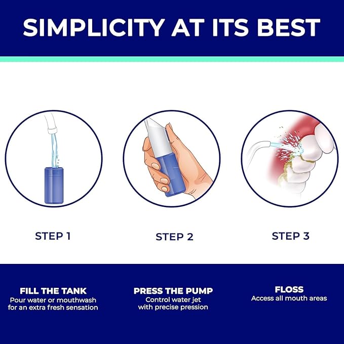 - Portable Design: This water flosser cordless operates manually, without batteries or cables. Its compact design includes a 90 ml tank, with nozzles that neatly fit inside the tank, making it exceptionally easy to carry for on-the-go dental care.