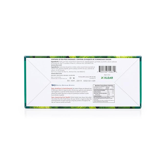 Spry Fresh Natural Xylitol Chewing Gum Dental Defense System - Aspartame-Free, Sugar-Free, Non-GMO, Gluten-Free (Spearmint, 10 Count Blister Cards - Pack of 20)