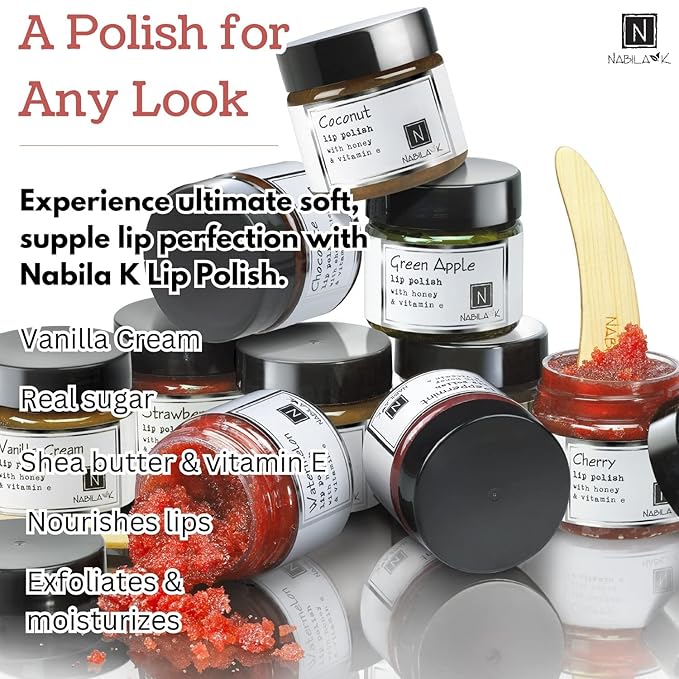 - Nabila K Vanilla Cream Lip Polish is a natural, sugar-based lip polish scrub for dry lips. A lip exfoliator made with nourishing, real ingredients like sweet almond oil and honey smooth lips, leaving them feeling super soft. Sloughs off dry skin and flakiness to reveal beautiful, healthy lips.