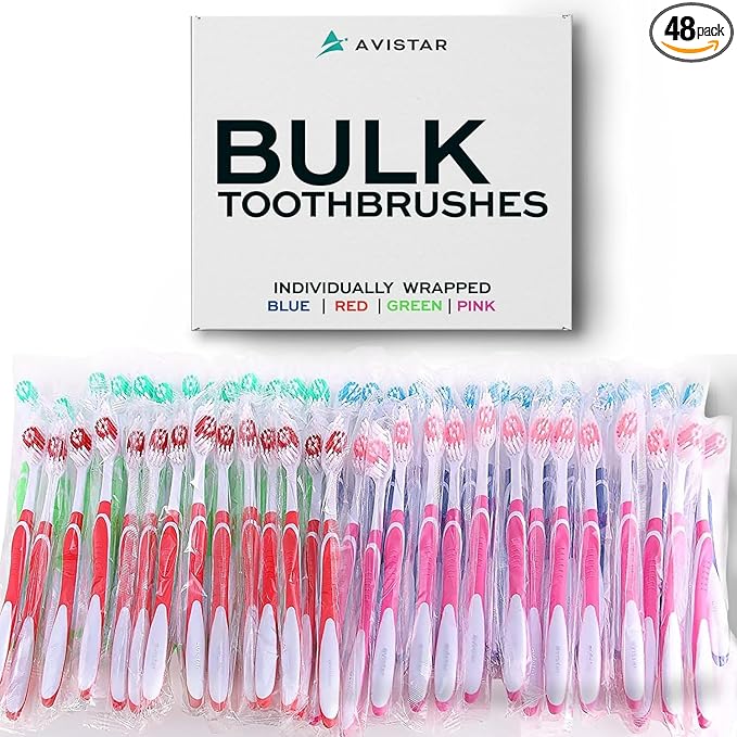 - 48 Toothbrushes In Multiple Colors - Not only are you getting quality and quantity, but you also get variety. Avistar brushes come in four beautiful colors: Red, Blue, Green & Pink!