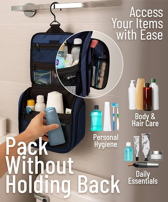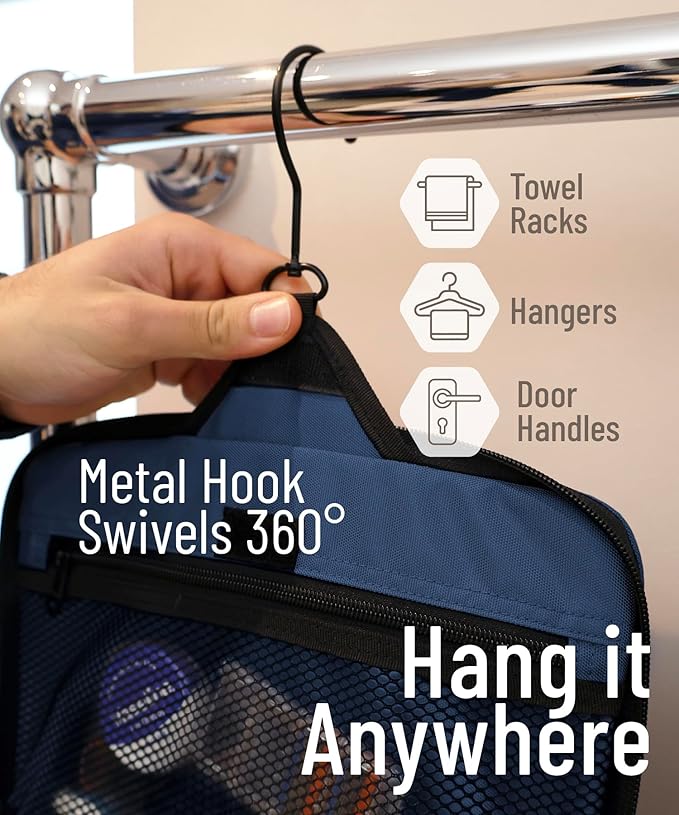 - HANG IT ANYWHERE: While traveling you don’t always know what your bathroom will be like. Each one is different, and we want you to be prepared for all of them. Our bag comes with an XL Metal Swivel Hook that makes it easy to hang up anywhere and keeps counters free of clutter. You can use this versatile dopp kit for the shower room at the gym, on a long-term backpacking trip or an overnight stay in a hotel. Our customers include backpackers, business men, outdoor enthusiasts and military staff.