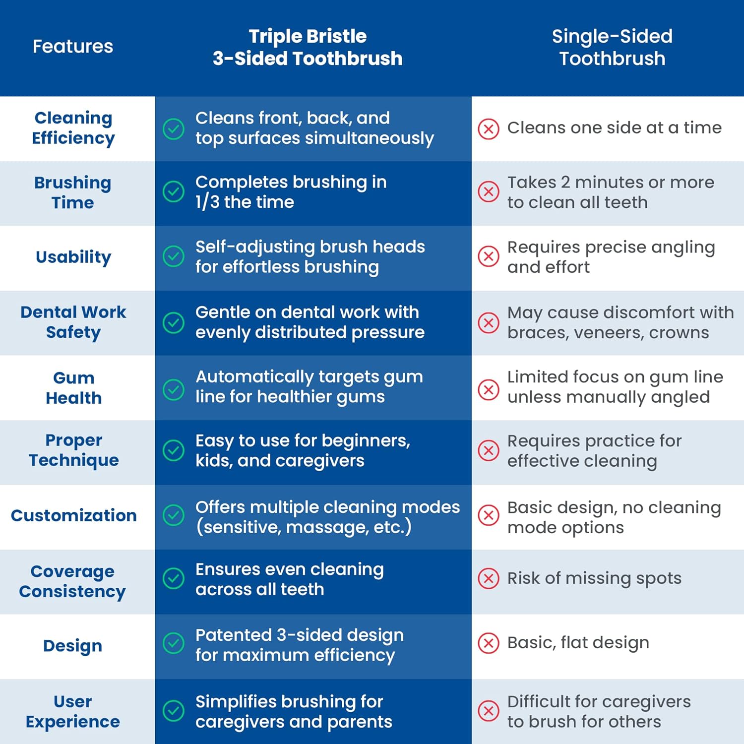 - DENTIST CREATED & DENTIST APPROVED - Our unique three sided toothbrush design is revolutionizing the way we clean teeth. The triple bristle toothbrush is recommended by Dentists across the United States.