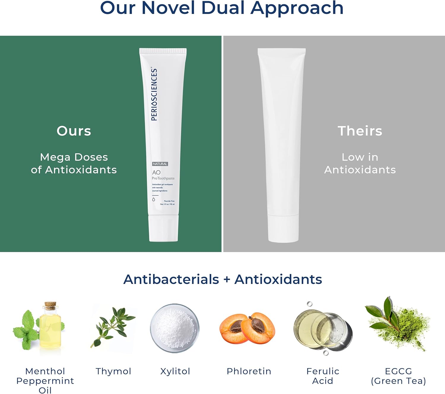 - For your oral health - Periosciences Natural Toothpaste gently removes stains + thoroughly takes care of your teeth without fluoride or harsh chemicals. Antioxidants phloretin and ferulic acid work with green tea catechins for maximum antioxidant effect for teeth and gums.
