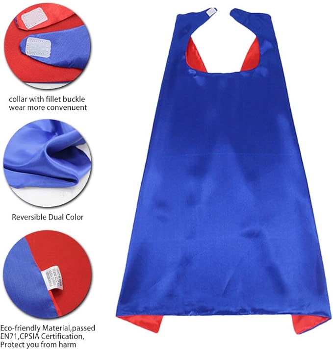 - Material: Super Hero Capes for Kids , made of satin, soft and comfort; superhero masks is made of felt fabric so they are soft for little faces,pretty sturdy and durable.The buckle fastener at the neck safe and easy to put on and off by kids