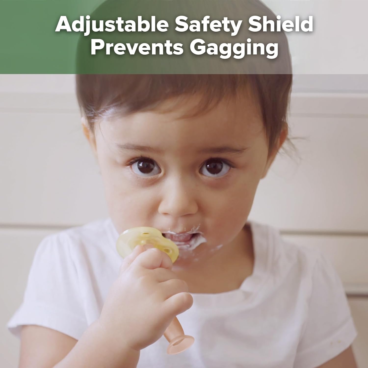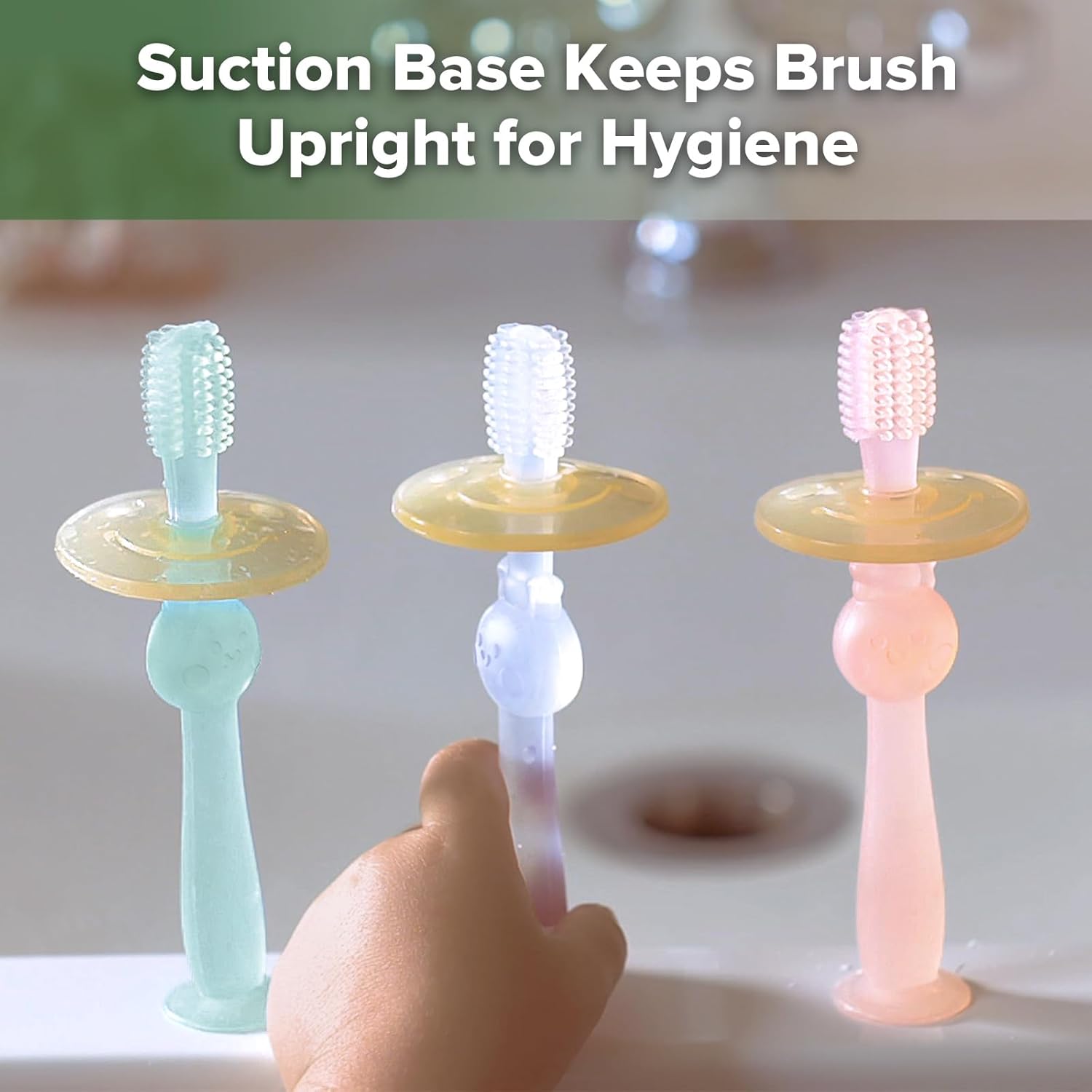 - EASY-GRIP HANDLE & HYGIENIC UPRIGHT STORAGE : Designed for small hands, this handle encourages independent brushing.The suction base allows the brush to stand upright on smooth surfaces, keeping bristles clean. Easy care–simply boil to sterilize!
