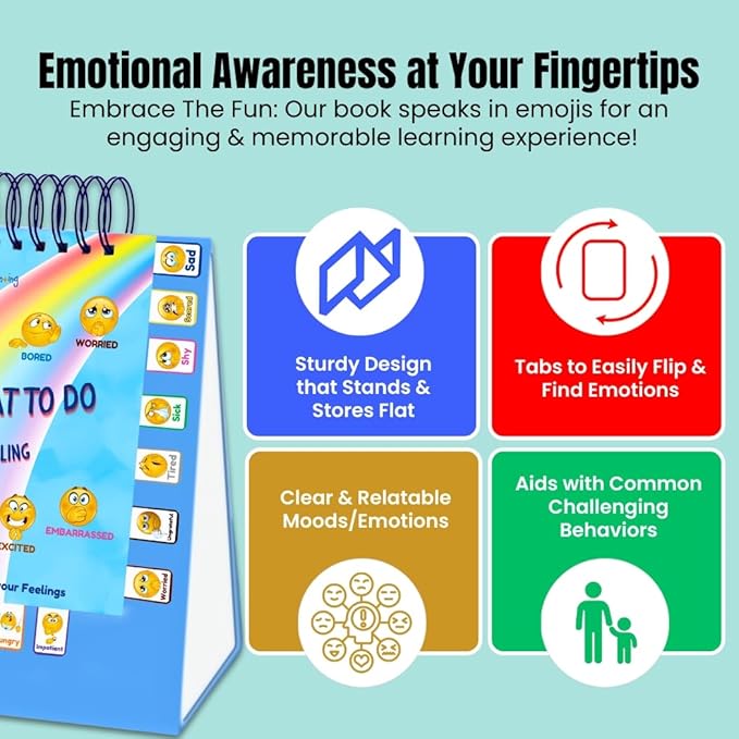 - Understand & Express Everyday Feelings: Visually guides children ages 3–5 to recognize and name their emotions. This flipbook focuses on common feelings kids experience every day and helps build self-awareness and emotional vocabulary—essential skills for communication and healthy social growth.