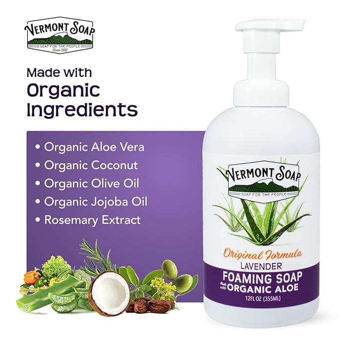 VERMONT SOAP Organic Lavender Foaming Hand Soap - Natural Moisturizing Soap for Dry Skin - Fragrance Free Liquid Bathroom Hand Soap Dispenser - Lavender - 12 oz