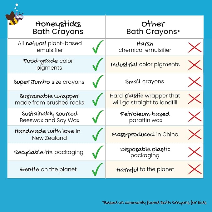 - GENTLE ON THE PLANET: Unlike others that are wrapped in plastic, Honeysticks Bath Crayons have a unique wrapper made from crushed rocks (how cool is that!). Packaged in a recyclable metal tin. Great eco friendly gift for kids that will be much loved by boys and girls alike.