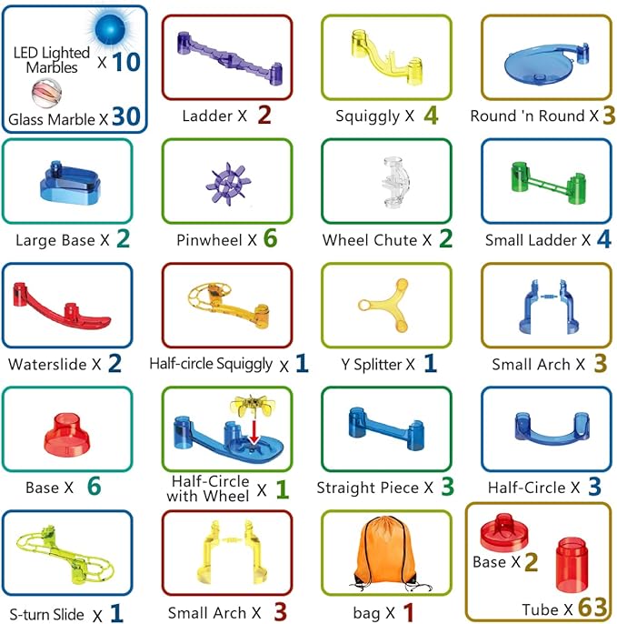 - Meland marble run set includes 113 marble building pieces, 30 glass marbles and 10 led lighted marbles. Marble tracks include action pieces, squiggly, wheels, Y-splitter, S-turn slide, centrifugal funnels, U-turn slides, windmills, straight slides and gradient slides, height 70cm or so for much more fun. Just build various towers and see marbles go up, down, all around, and fast!