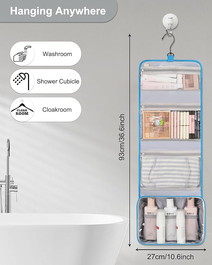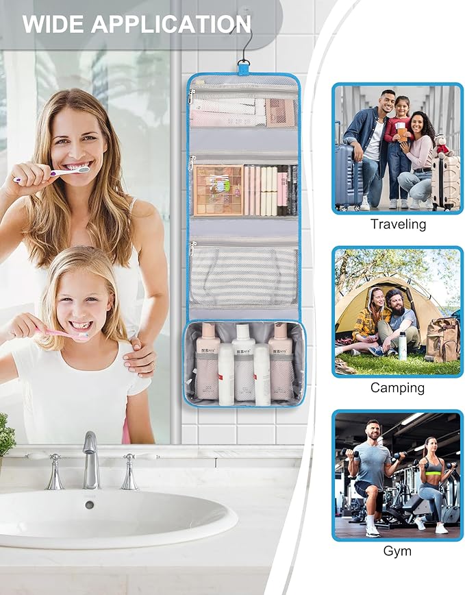 - 【LARGE CAPACITY TOILETRY BAG】Foldable size with 10.6 x 8.5 x 2.4 inch, Open size with 10.6 x 32.5 inch (not include the hook). 4 separate compartments with zipper, suitable for your family trip to pack all men, women and kids toiletries.