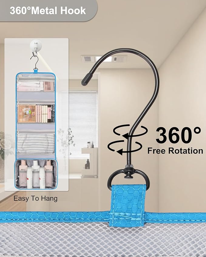 - 【CONVENIENT DESIGN】Stow-away 360 degree swivel non-slip metal hook for versatile hanging options. It fits bottles upright, helps eliminate spills, and makes a great travel organizer for your travel toiletries.