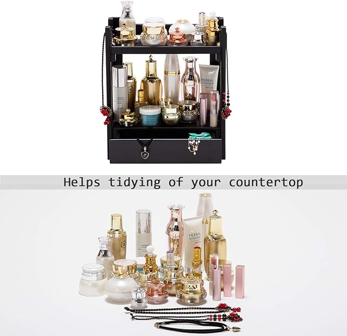 - 2-Tier Versatile Storage: The bamboo shelf has 2 layers and a drawer for easy storage. You can organize your perfumes, bath, and beauty products on the shelves and tuck away your accessories, watches, and jewelry for easy access in the bottom drawer