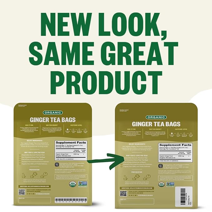 - ORGANIC GINGER TEA - The tea is filled into tea bags and packed into foil-lined kraft bags in California