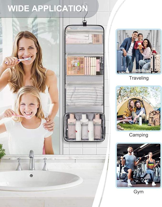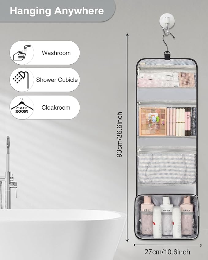 - 【LARGE CAPACITY TOILETRY BAG】Foldable size with 10.6 x 8.5 x 2.4 inch, Open size with 10.6 x 32.5 inch (not include the hook). 4 separate compartments with zipper, suitable for travel to pack all men, women and kids toiletries.
