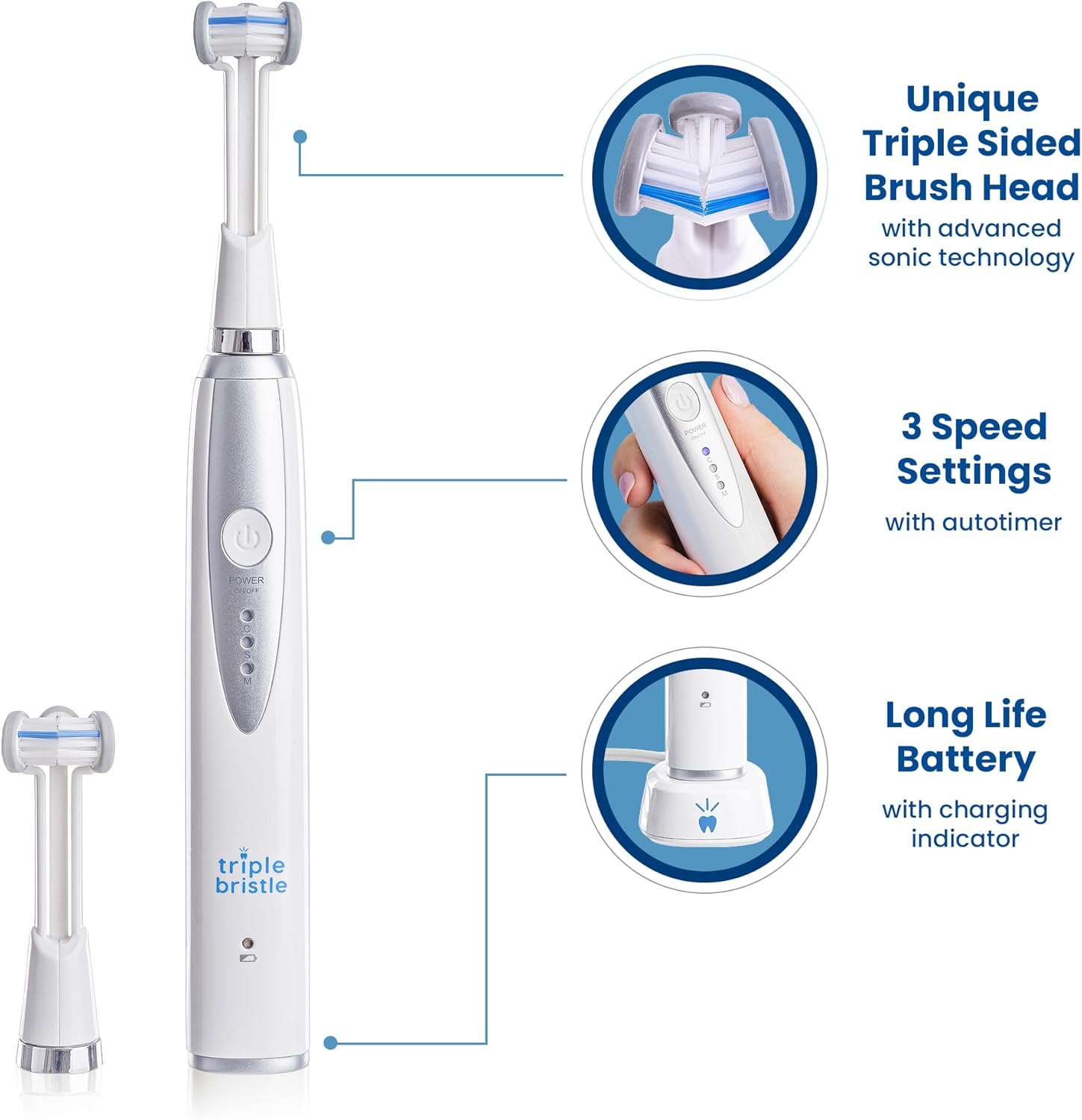 - TRIPLE BRISTLE KIDS: Start your child’s oral care journey out on the right path with our kids rechargeable sonic toothbrush. The patented kids sized 3-sided brush head gets the job done in 1/3 the time! Triple Bristle has been scientifically designed with 31,000 sonic stroke vibrations per minute to give your teeth the best possible clean in 1/3 the time of other kids toothbrushes. The 3 sided toothbrush kids friendly design Includes colorful stickers that will add a little fun to their brushing routine!