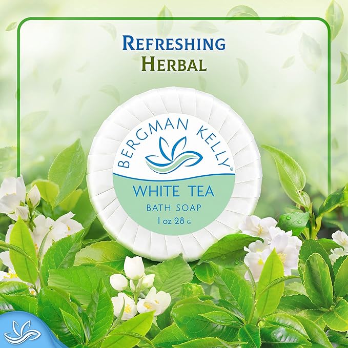 BERGMAN KELLY Round Hotel Soap Bars, Shampoo & Conditioner 3-Piece Set (1 oz each, 150 pc, White Tea), Delight Your Guests with Revitalizing & Refreshing Mini Travel Toiletries & Bulk Amenities