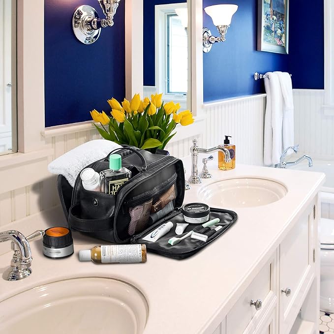 Elviros Toiletry Bag for Men, Large Travel Shaving Dopp Kit Water-resistant Bathroom Toiletries Organizer PU Leather Cosmetic Bags