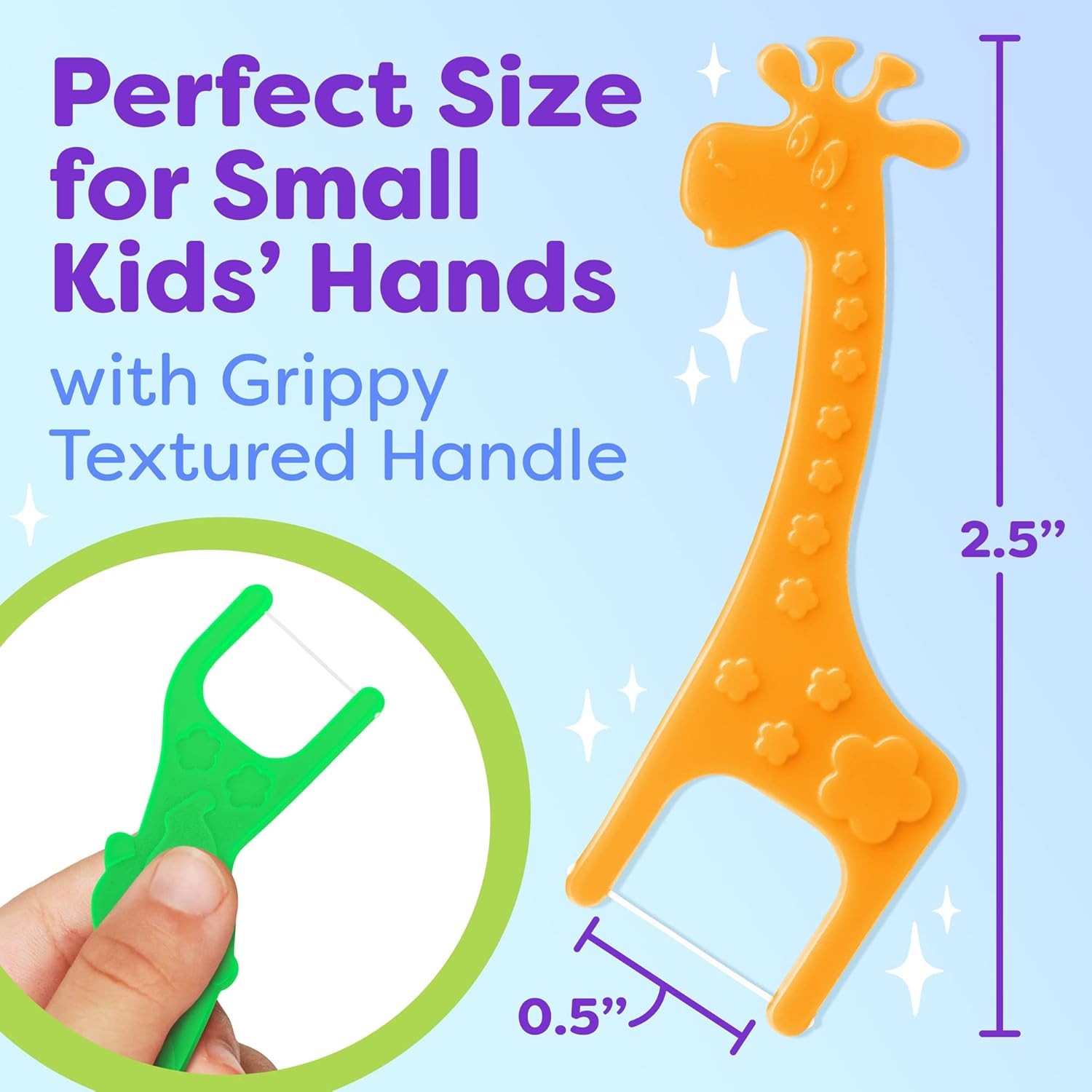 - A GRIPPY HANDLE FOR CHILDREN - We designed a textured handle for our floss sticks: it prevents kids from dropping the dental picks, and it’s easy for your little ones to hold. The size of the kids floss picks is perfect for a child’s small clumsy hand.