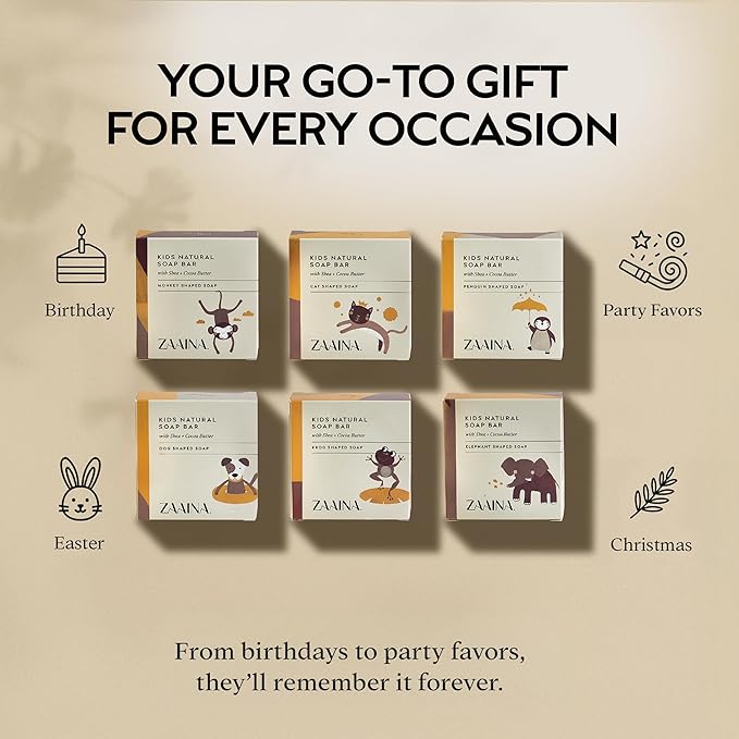 ZAAINA Kids Soap Bar (Set of 6) – Christmas Stocking Stuffers, Unique Natural Animal Shaped Soaps for Children, Gentle Bath Soap for Sensitive Skin, Fun Bath Time Gift for Boys Girls – Handmade in USA