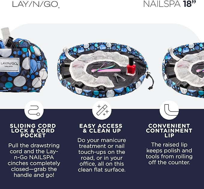 Lay-n-Go NailSpa Drawstring Cosmetic Bag - Portable Nail Supplies Organizer Bag w/ 8 Elastic Mesh Pockets & Circular Center - Durable, Machine Washable Nail Kit Organizer (18", Blue Polka Dot)