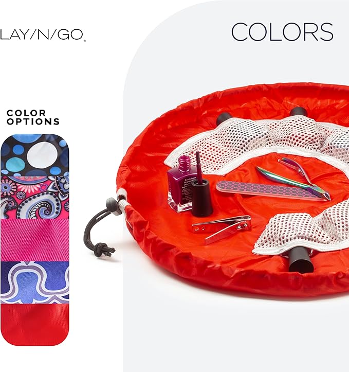 Lay-n-Go NailSpa Drawstring Cosmetic Bag - Portable Nail Supplies Organizer Bag w/ 8 Elastic Mesh Pockets & Circular Center - Durable, Machine Washable Nail Kit Organizer (18", Red)