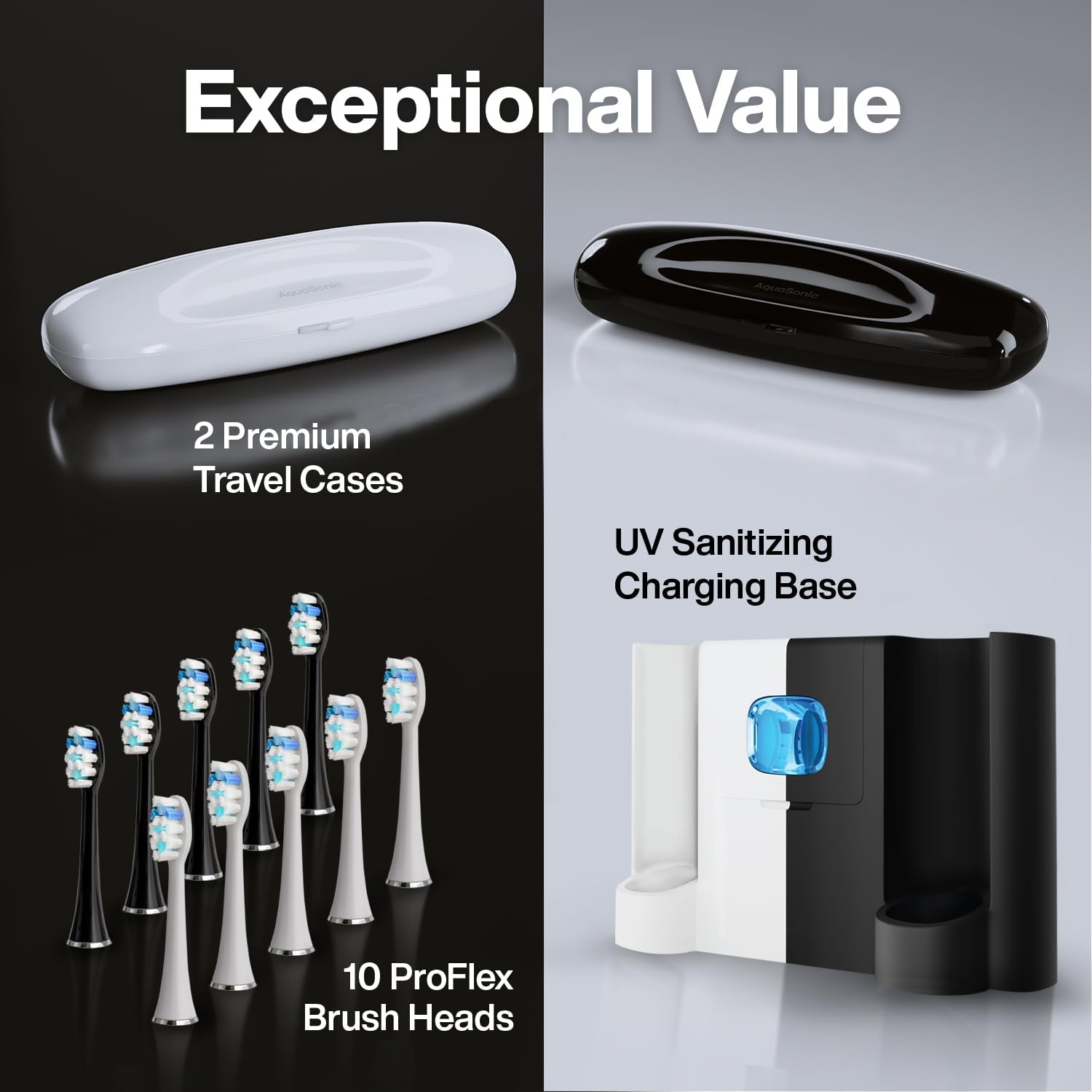 - Complete Oral Care Set: Includes 10 ProFlex replacement brush heads (lasting over a year for two users), 2 premium travel cases, and the dual-handle UV sanitizing and charging base — everything needed for a modern oral care upgrade.