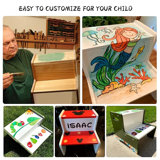 - PERFECT FOR GROWING KIDS: Wooden two step stool brings kids two steps closer to independence. Our dual height design with wide steps help toddlers step their way up to independence as they transition from toilet potty training to washing hands and brushing teeth at the sink, to finally reaching countertops and cabinets in your bathroom and kitchen.
