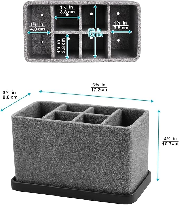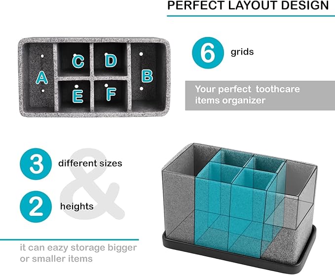 - Large Electric Toothbrush Holder: With 6 storage compartments, the tooth brush holder has enough space for your toothbrushes, toothpaste, dental floss, razor, comb, shaver, eyebrow trimmer, makeup brushes and more