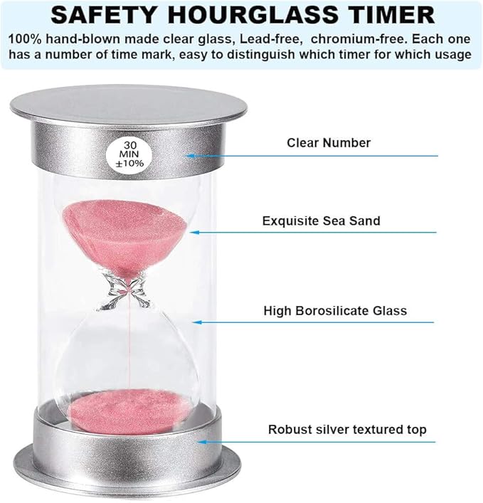 - Safety Hourglass Timer: The 30-minute sand timer made by friendly high borosilicate glass and acrylic material. And each hour glass has a digital time mark. easy to distinguish which timer for which usage