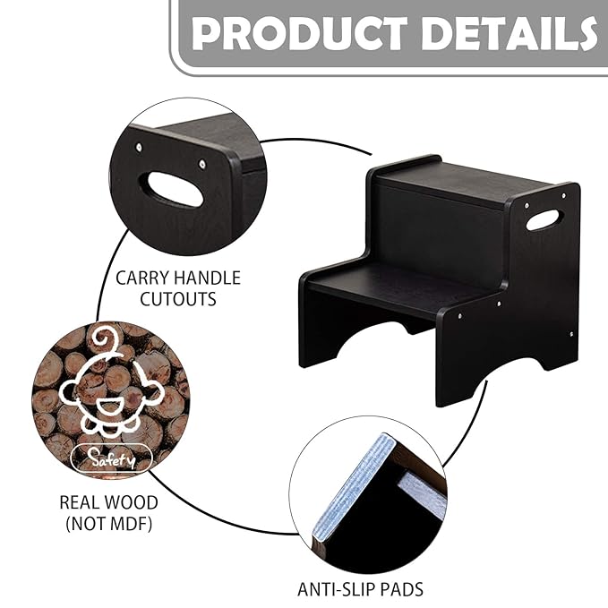 WOOD CITY Step Stool for Kids, Wooden Toddler Step Stool with Safety Non-Slip Mats and Handles for Kitchen, Bathroom Sink & Potty Training - Black