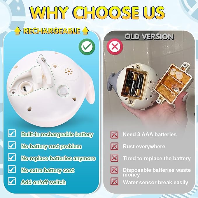 - Safe and Durable Use - no battery rust problems: We know that water leakage into the battery compartment is a significant problem of this cute whale bath toy. We design the built-in battery and use a silicone plug to protect the small USB charging port, preventing water seepage damage more effectively and protecting the baby's health. Our baby bath toys 12-18 months have longer service life than other brands. Have a try and Give your baby a cute interesting toddler pool toy