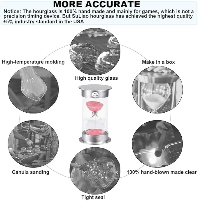 - Notice: This hourglass sand timer is mainly made for games, which is not a precision timing device, so there is time deviation. But SuLiao kids hourglass timer has achieved the highest quality ±5% industry standard in the USA