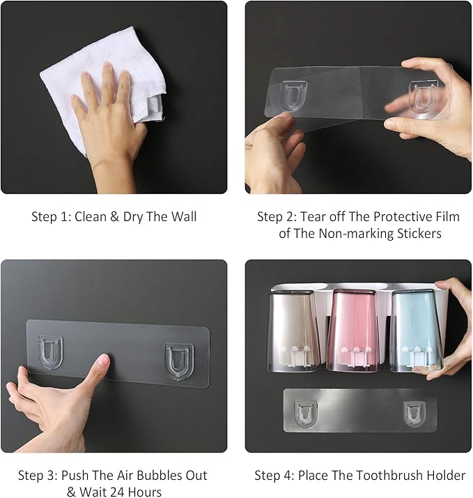 - [EASY TO INSTALL]: The toothbrush holder wall mounted no need to drill, just wipe the wall, tear off the protective film of the strong stickers, push the air out and place toothbrush holder, simple and fast. Convenient to store toiletries, refuse messy.