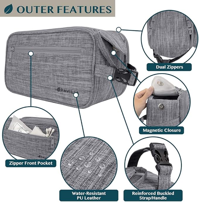 - WATER RESISTANT TOILETRY BAG DOPP KIT: This toiletry case kit is made from high density PU leather with added side padding for durability and extra protection to keep your toiletries safe and protected during travel. The lining is water-resistant to prevent liquid splashes from entering the bag or luggage. The toiletry bag also offers excellent wet/dry separation so you can keep wet accessories in a separate compartment from dry toiletries during camping, road trips, weekenders.