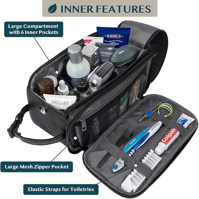 - WATER RESISTANT TOILETRY BAG DOPP KIT: This toiletry case kit is made from high density PU leather with added side padding for durability and extra protection to keep your toiletries safe and protected during travel. The lining is water-resistant to prevent liquid splashes from entering the bag or luggage. The toiletry bag also offers excellent wet/dry separation so you can keep wet accessories in a separate compartment from dry toiletries during camping, road trips, weekenders.
