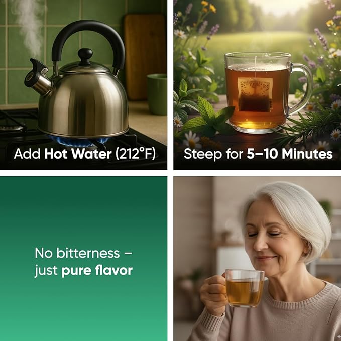 - STEEPING INSTRUCTIONS : Boil water to 200°F (93°C), pour over one round tea bag, and steep for 5–7 minutes. For a stronger flavor, adjust the steeping time. Whether you’re brewing it hot or preparing it as a chilled iced tea, this easy-to-brew herbal tea delivers smooth, refreshing taste every time.