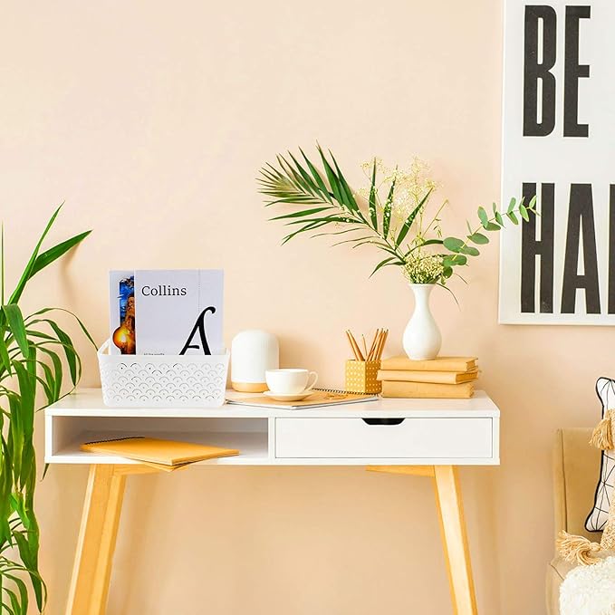 STARVAST 5 Pack Plastic Storage Baskets, Portable White Fish Scale Pattern Hollow Desktop Storage Bin Box with Handle for Kitchen, Bathroom, Kids Room or Nursery Storage – 9.4 x 7.1 x 4.1 inches