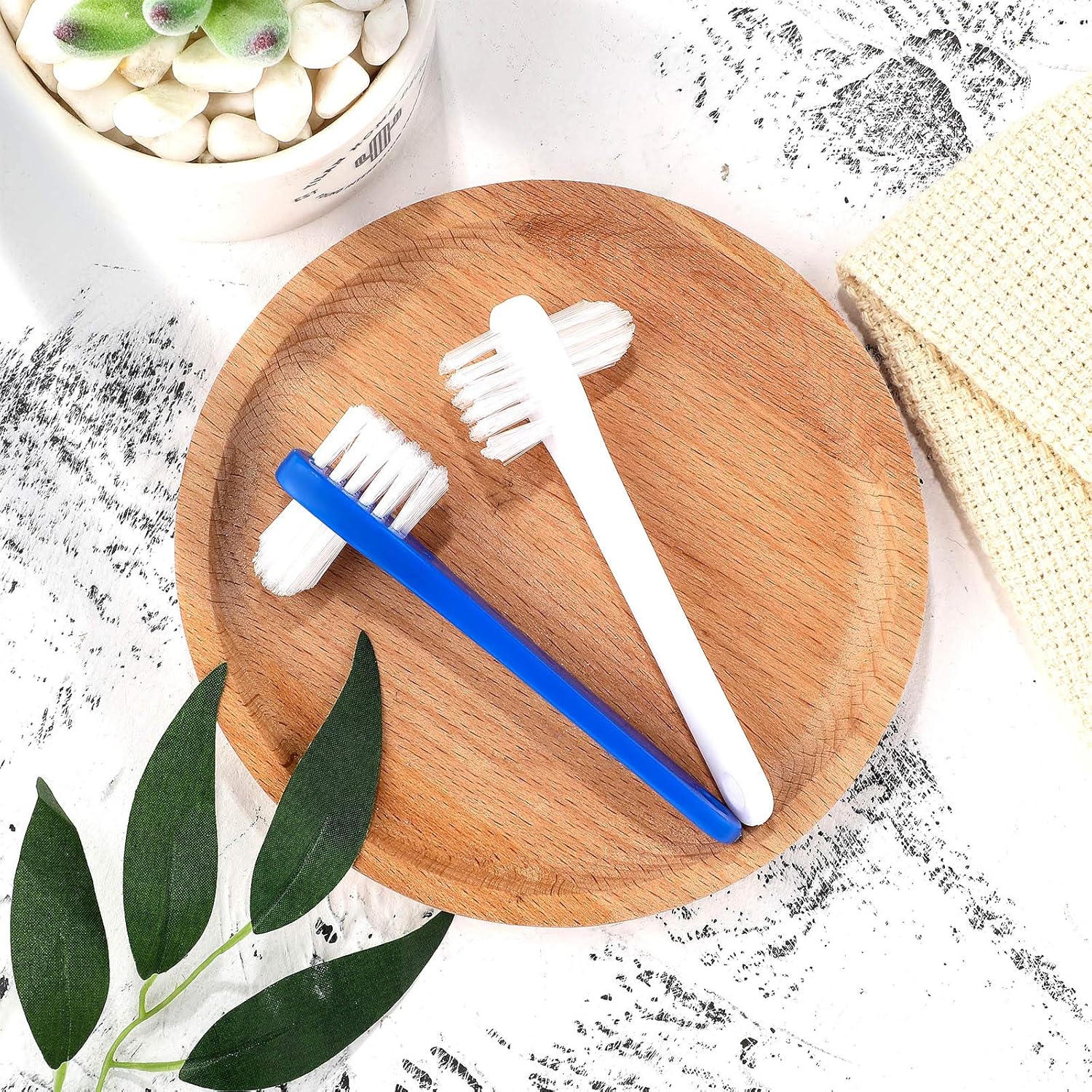 - 6 Pack Dual Head Toothbrushes: 6 pieces of dual head denture toothbrush for false teeth in blue and white, sufficient quantity can meet your long time use and replace needs; Compact handle about 4.1 inch long provides firm grip, and reliably reaches different parts of the denture