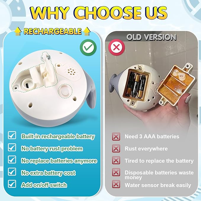 - Safe and Durable Use - no battery rust problems: We know that water leakage into the battery compartment is a significant problem of this cute whale bath toy. We design the built-in battery and use a silicone plug to protect the small USB charging port, preventing water seepage damage more effectively and protecting the baby's health. Our baby bath toys 12-18 months have longer service life than other brands. Have a try and Give your baby a cute interesting toddler pool toy
